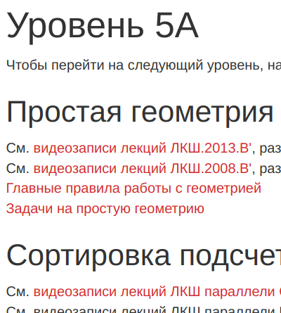 Темы разбиты по уровням по возрастанию сложности: от основ синтаксиса до продвинутых алгоритмов. По большинству тем есть теоретические материалы (статьи, советы, видеолекции) и задачи.